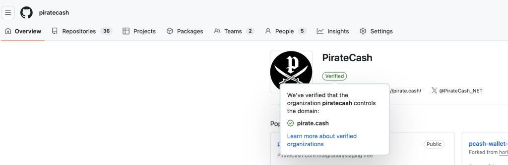 GitHub has confirmed that the PirateCash team controls the pirate.cash domain. This verification establishes an additional layer of authenticity between the open source code published under the PirateCash organization and the core development team maintaining the project.